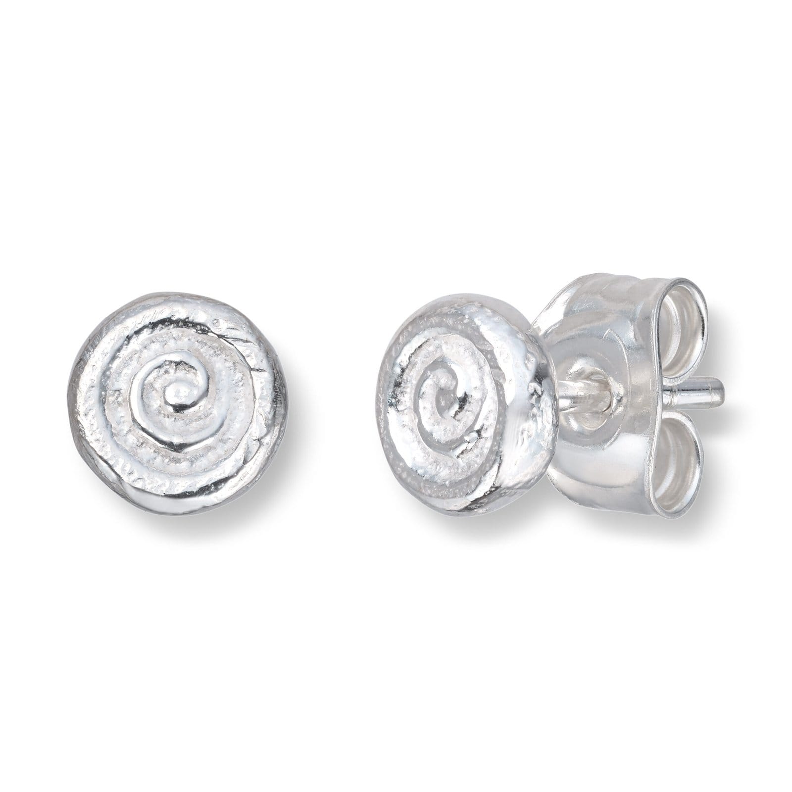Et par små øredobber, ca 5 mm, rund form. 925 sølv, formet som en konkylie. Et design-samarbeid med Tromsø musiker Aggie Frost